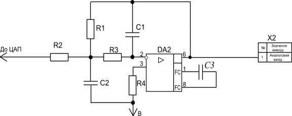 g – коефіцієнт заповнення прямокутних імпульсів напруги Z. Сигнал, що отримується з виходу ЦАП, необхідно профільтрувати для отримання достовірного сигналу постійної напруги. Для цього використовується активний фільтр низьких частот Баттерворта другого порядку, що дозволяє подавляти 40 Дб/дес. Схема фільтру Баттерворта другого порядку представлена на рисунку 4.4
