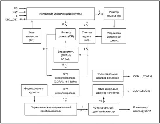 Несколько слов о процессе инициализации ЖКИ-модуля. Производитель контроллера рекомендует выполнять следующую последовательность действий для инициализации. Выдержать паузу не менее 15 мс между установлением рабочего напряжения питания (> 4,5 В) и выполнением каких-либо операций с контроллером. Первой операцией выполнить команду, выбирающую разрядность шины (это должна быть команда $30 независимо от того, какой разрядности интерфейс вы собираетесь использовать в дальнейшем), причем перед выполнением этой операции не проверять значение флага BF. Далее опять выдержать паузу не менее 4,1 мс и повторить команду выбора разрядности шины, причем перед подачей команды вновь не производить проверку флага BF. Следующим шагом необходимо вновь выдержать паузу, на этот раз 100 мкс, и в третий раз повторить команду установления разрядности шины, вновь без проверки BF. Эти три операции являются инициализирующими и призваны вывести контроллер в исходный режим работы (то есть перевести в режим работы с 8-ми разрядной шиной) из любого состояния. Следом за ними нормальным порядком (без выдерживания пауз, но с проверкой флага BF) выполняется инициализация режимов работы с выдачей инициализирующей последовательности, аналогичной указанной в таблице 2.19 (содержащей в том числе команду выбора необходимой разрядности шины). Необходимо помнить, что когда Вы объявляете режим работы с 4-х разрядной шиной, то есть выдаете команду $20, то делаете это обычно из 8-ми разрядного режима, который устанавливается автоматически после подачи напряжения питания, а значит вы не сможете адекватно объявить необходимое значение флагов N и F, располагающихся в младшей тетраде команды установки разрядности шины. Поэтому команду необходимо повторить в уже установившемся 4-х разрядном режиме путем последовательной передачи двух тетрад, то есть для 4-х разрядного режима образом. 3. Описание функциональной схемы