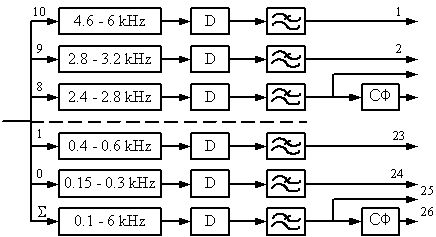 Д – детектирующее устройство; СФ – субформанта – спектральный максимум производной по времени от временной огибающей, образуемый на выходе соответствующего полосового фильтра. 1 – 8 выделяют обычные форманты. В канал поступает информация о форманте, ее амплитуде и о субформанте. 9, 10 – распознают шумовые фонемы. 0 – выделение гласных фонем.