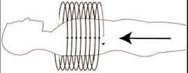 Рисунок 5 – Схема обследования при пошаговом сканировании: 1 – сбор данных; 2 – движение стола; 3 – команда задержки дыхания; 4 – сбор данных; 5 – команда нормального дыхания; 6 – движение стола; 7 – реконструкция изображения Движение пациента во время сбора данных при различных положениях трубки вызывает артефакты изображений и ограничивает области диагностического применения. Более сложным является винтовое (спиральное) сканирование, которое стало возможным благодаря появлению конструкции гентри с кольцом скольжения, позволяющим трубке и детекторам вращаться непрерывно. Достоинство спиральной КТ заключается в непрерывном накоплении данных, осуществляемом одновременно с движением пациента через раму (рис. 6). Расстояние перемещения пациента за оборот рамы соответствует скорости движения стола. Поскольку данные накапливаются непрерывно, рабочий цикл в спиральной КТ близок к 100%, а отображение изображаемого объема происходит быстрее. Обычно при реконструкции изображений в спиральной КТ используются алгоритмы интерполяции, которые позволяют выделить из общего набора данные, необходимые для построения изображения отдельного среза при каждом положении стола.
