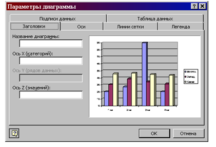 К элементам, которые можно изменять, относятся: - "пол" объемной диаграммы; - "стенки" объемной диаграммы; - стрелки; - оси; - диаграммы; - серия данных (любая); - линии сноски; - линии сетки; - габаритные линии; - легенды; - графические области; - линии серии; - текст; - полосы прокрутки. Для перехода к форматированию элемента диаграммы есть много способов. С этой целью можно выбрать элемент из списка в панели инструментов. Как правило, двойной щелчок мыши на объекте в окне диаграммы поднимает диалоговое окно, содержащее доступные опции форматирования. Для вызова этого диалогового окна можно также воспользоваться пунктом меню Формат, где будет находиться подпункт, соответствующий выделенному объекту, например Выделенный ряд. Наконец, окно форматирования можно вызвать, щелкнув правой кнопкой мыши на изменяемом объекте и выбрав в локальном меню нужный подпункт, например Формат рядов данных. Ввод присоединенного текста заголовка. Для задания заголовков осей и/или всей диаграммы служит пункт меню Диаграмма | Параметры диаграммы. Во вкладке Заголовки нужно выбрать объекты, которые требуется озаглавить. Перечень объектов различается в зависимости от типа диаграммы. Такой текст, относящийся к конкретному объекту, входящему в состав диаграммы, называется присоединенным.