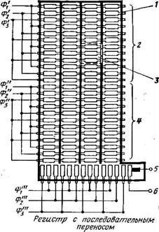 Рис.15. ФСИ с кадровой организацией: 1 - каналоограничивающая диффузионная область; 2 - оптическая секция; 3 - элемент изображения; 4 - секция хранения; 5 - выход видеосигнала; 6 - выходной затвор ФСИ с кадровой организацией состоит из трех секций (рис.15): фотоприемной (оптической), представляющей собой матрицу ПЗС требуемого формата; секции хранения того же формата, в которой хранится картина зарядов; секции считывания, состоящей из СР на ПЗС и выходного считывающего элемента, преобразующего зарядовые пакеты в видеосигналы. Картина зарядов, накопленные в фотоприемной секции, после окончания кадра с помощью соответствующей последовательности тактовых импульсов быстро сдвигается в секцию хранения. Таким образом, после восприятия изображения весь кадр сдвигается в секцию хранения и фотоприемная секция готова к приему следующего кадра. В течение времени формирования следующего кадра информация из секции хранения построчно передается в выходной СР, откуда она поэлементно передается на выходной считывающий элемент (подобно тому, как в строчном ФСИ). Тактовая частота сдвига в выходном регистре должна быть в r раз (где r — количество элементов в одной строке) выше тактовой частоты в секции хранения для того, чтобы к моменту поступления в регистр следующей строки обеспечить передачу на выход всех зарядовых пакетов предыдущей строки. Достоинствами кадровой организации процесса Сканирования являются высокое качество передаваемого изображения, возможность чересстрочной развертки, топологическая простота и регулярность кристалла. Высокое качество видеосигналов достигается благодаря тому, что после восприятия изображения картина зарядов быстро сдвигается в защищенную от света секцию хранения и поэтому не происходит дополнительной засветки при сканировании, вызывающей искажения видеосигналов. Чересстрочная развертка является прогрессивным методом считывания информации, позволяющим вдвое уменьшить частоту следования видеосигналов при сохранении того же качества изображения. В ФСИ на ПЗС она может быть получена следующим образом. В трехтактной системе каждый светочувствительный элемент содержит три электрода. При интегрировании изображения только один из них находится под напряжением смещения и накапливает заряды, два остальных электрода необходимы для направленной передачи зарядов и используются только при сдвиге картины зарядов в секцию хранения. Такую избыточность электродов в режиме восприятия изображения можно использовать так. В течение первого полукадра напряжение смещения подается на одну группу электродов, например, на первые электроды светочувствительных элементов. Накопленные заряды сдвигаются в секцию хранения. В течение второго полукадра напряжение смещения подается на все электроды, и заряды накапливаются под ними. Следовательно, один и тот же светочувствительный ПЗС-элемент используется для восприятия различных элементов изображения, т. е. применение чересстрочной развертки позволяет вдвое увеличить разрешающую способность матрицы на ПЗС при сохранении того же количества элементов. Примером этого служит разработанная фирмой RCA передающая камера, имеющая 256X320 светочувствительных элементов и обеспечивающая в то же время получение 512X320 элементов разложения, т. е. практически полный телевизио