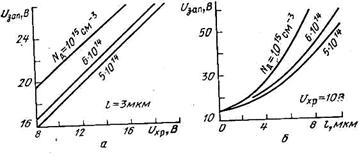 Рис.7. Зависимость минимальной амплитуды импульса записи от напряжения хранения (а), длины зазора (б) и концентрации примеси в подложке (в). где L — длина затворов (электродов) ПЗС; μрэ—поверхностная эффективная подвижность. Очевидно, что коэффициент пропорциональности в (4) зависит от
