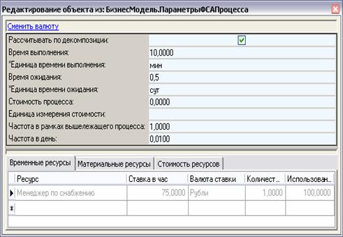 Рисунок 4.5- Параметры ФСА процесса Каждый процесс может быть представлен совокупностью подпроцессов, поэтому стоимость и время выполнения процесса могут быть рассчитаны с учетом стоимости и времени выполнения его подпроцессов. Способ расчета параметров ФСА процесса определяется параметром «Рассчитывать по декомпозиции» типа «логика». Если установлен параметр «Рассчитывать по декомпозиции», стоимость и время выполнения процесса будут определены с учетом стоимостей и времен выполнения подпроцессов. В противном случае – стоимость и время выполнения процесса задаются вручную. Если при задании стоимостей ресурсов или процессов используются разные валюты, информацию о курсах валют необходимо внести в справочник «Курсы валют». Это позволит системе осуществлять перевод значений стоимости из одной валюты в другую (Рисунок 4.6)