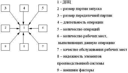 Рис. 1.1. Влияние факторов на ДПЦ При этом под операцией понимается часть производственного процесса обработки ПТ на одном рабочем месте без переналадки оборудования одним рабочим или группой рабочих при помощи одних и тех же орудий труда. Под партией запуска понимается определенное количество предметов труда ПТ одного наименования, обрабатываемых (или собираемых) на данной операции с однократной затратой подготовительно-заключительного времени. Под передаточной партией (“пакетом”) понимается часть партии запуска, прошедшая обработку на данной и транспортируемая на непосредственно следующую за ней операцию. Под заделом в общем случае понимается скопление ПТ (в ожидании обработки) между двумя непосредственно следующими друг за другом операциями. Различают оборотные и страховые (резервные) заделы [10, с.8-10]. 2. Структура производственного цикла Производственный цикл состоит из двух частей: рабочего периода, т.е. периода, в течение которого предмет труда находится непосредственно в процессе изготовления и времени перерывов в этом процессе (рис. 2.1). Рабочий период - это время, в течение которого производится непосредственное воздействие на предмет труда либо самим рабочим, либо машинами и механизмами под его управлением; время подготовительно-заключительных работ; время естественных технологических процессов; время технологического обслуживания. Т.е. рабочий период состоит из времени выполнения технологических и нетехнологических операций; к числу последних относятся все контрольные и транспортные операции с момента выполнения первой производственной операции и до момента сдачи законченной продукции. Время выполнения технологических операций и подготовительно-заключительных работ называется операционным циклом. Время естественных технологических процессов - это время, в течение которого предмет труда изменяет свои характеристики без непосредственного воздействия человека или техники. Время технологического обслуживания включает в себя: контроль качества обработки изделия; контроль режимов работы машин и оборудования, их настройку, легкий ремонт; уборку рабочего места; подвоз заготовок, материалов, приемку и уборку обработанной продукции. На длительность рабочего периода оказывает влияние разного рода факторы, например: качество проектно-конструкторских работ; уровень унификации и стандартизации изделий; степень точности изделий (высокая точность требует дополнительной обработки, что удлиняет производственный цикл); организационные факторы (организация рабочего места, размещение складских помещений и др.). Недостатки организационного характера увеличивают подготовительно-заключительное время.
