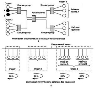 Рис. 3.3. Логическая и физическая топологии сети Другим примером несовпадения физической и логической топологий сети является уже рассмотренная сеть на рис. 3.2, а. Концентратор Ethernet поддерживает в сети физическую топологию звезда. Однако логическая топология сети осталась без изменений - это общая шина. Так как концентратор повторяет данные, пришедшие с любого порта, на всех остальных портах, то они появляются одновременно на всех физических сегментах сети, как и в сети с физической общей шиной. Логика доступа к сети совершенно не меняется: все компоненты алгоритма случайного доступа - определение незанятости среды, захват среды, распознавание и отработка коллизий - остаются в силе. Физическая структуризация сети с помощью концентраторов полезна не только для увеличения расстояния между узлами сети, но и для повышения ее надежности. Например, если какой-либо компьютер сети Ethernet с физической общей шиной из-за сбоя начинает непрерывно передавать данные по общему кабелю, то вся сеть выходит из строя, и для решения этой проблемы остается только один выход - вручную отсоединить сетевой адаптер этого компьютера от кабеля. В сети Ethernet, построенной с использованием концентратора, эта проблема может быть решена автоматически - концентратор отключает свой порт, если обнаруживает, что присоединенный к нему узел слишком долго монопольно занимает сеть. Концентратор может блокировать некорректно работающий узел и в других случаях, выполняя роль некоторого управляющего узла. 4.2.2 Логическая структуризация сетиФизическая структуризация сети полезна во многих отношениях, однако в ряде случаев, обычно относящихся к сетям большого и среднего размера, невозможно обойтись без логической структуризации сети. Наиболее важной проблемой, не решаемой путем физической структуризации, остается проблема перераспределения передаваемого трафика между различными физическими сегментами сети. В большой сети естественным образом возникает неоднородность информационных потоков: сеть состоит из множества подсетей рабочих групп, отделов, филиалов предприятия и других административных образований. Очень часто наиболее интенсивный обмен данными наблюдается между компьютерами, принадлежащими к одной подсети, и только небольшая часть обращений происходит к ресурсам компьютеров, находящихся вне локальных рабочих групп. (До недавнего времени такое соотношение трафиков не подвергалось сомнению, и был даже сформулирован эмпирический закон «80/20», в соответствии с которым в каждой подсети 80 % трафика является внутренним и только 20 % - внешним.) Сейчас характер нагрузки сетей во многом изменился, широко внедряется технология intranet, на многих предприятиях имеются централизованные хранилища корпоративных данных, активно используемые всеми сотрудниками предприятия. Все это не могло не повлиять на распределение информационных потоков. И теперь не редки ситуации, когда интенсивность внешних обращений выше интенсивности обмена между «соседними» машинами. Но независимо от того, в какой пропорции распределяются внешний и внутренний трафик, для повышения эффективности работы сети неоднородность информационных потоков необходимо учитывать. Сеть с типовой топологией (шина, кольцо, звезда), в которой все физические сегменты рассматриваются в качестве одн