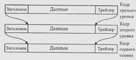 Рис. 4.2. Пример обмена пакетами при сеансе связи В процессе сеанса обмена информацией по сети между передающим и принимающим абонентами происходит обмен информационными и управляющими пакетами по установленным правилам, называемым протоколом обмена. Пример простейшего протокола показан на рис. 4.2. В данном случае сеанс связи начинается с запроса готовности приемника принять данные. В случае, когда приемник готов, он посылает в ответ управляющий пакет «Готовность». Если приемник не готов, он отказывается от сеанса другим управляющим пакетом. Затем начинается собственно передача данных. При этом на каждый полученный пакет данных приемник отвечает пакетом подтверждения. В случае, когда пакет передан с ошибками, приемник запрашивает повторную передачу. Заканчивается сеанс управляющим пакетом, которым передатчик сообщает о разрыве связи. Существует множество стандартных протоколов, которые используют как передачу с подтверждением (с гарантированной доставкой пакета), так и передачу без подтверждения (без гарантии доставки пакета). При реальном обмене по сети используются многоуровневые протоколы, каждый из которых предполагает свою структуру кадра (свою адресацию, свою управляющую информацию, свой формат данных и т.д.). Ведь протоколы высоких уровней имеют дело с такими понятиями, как файл-сервер или приложение, запрашивающее данные у другого приложения, и вполне могут не иметь представления ни о типе аппаратуры сети, ни о методе управления обменом. Все кадры более высоких уровней последовательно вкладываются в передаваемый пакет, точнее, в поле данных передаваемого пакета (рис. 4.3). Каждый следующий вкладываемый кадр может содержать свою собственную служебную информацию, располагающуюся как до данных (заголовок), так и после данных (трейлер), причем ее назначение может быть самым различным. Естественно, доля вспомогательной информации в пакетах при этом возрастает с каждым следующим уровнем, что снижает эффективную скорость передачи данных. Поэтому для увеличения этой скорости лучше, чтобы протоколы обмена были как можно проще, и чтобы уровней этих протоколов было как можно меньше.