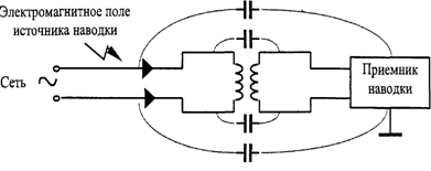 Сеть Эти виды распространения наводок по сети питания являются ассиметричными или однопроводными, поскольку оба провода сети питания передают сигнал наводки в одном направлении. Обратным проводом является земля. Симметричное распространение наводки имеет место в случае, когда на проводах сети индуцируются различные напряжения относительно земли. Между проводами образуется высокочастотная разность потенциалов, и по проводам сети проходят токи наводки в разных направлениях. В приемнике наводки индуцируются равные по величине и обратные по знаку напряжения, которые не могут проникнуть в высокочастотную часть приемника и не являются опасными.