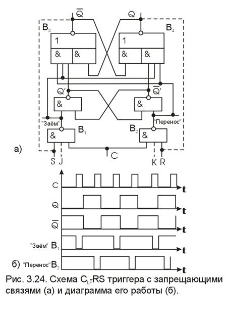 Важной особенностью этой схемы является то, что в режиме Т-триггера она формирует сигналы «Перенос» и «Заем» (рис. 5, б). Другой особенностью М-S-триггера является то, что он может