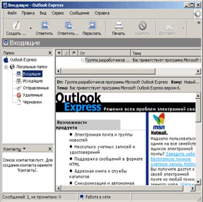 Microsoft позиціонує свій продукт Outlook Express як додатковий додаток до Internet Explorer для роботи з електронною поштою. Інтерфейс поштового клієнта має багато загального з вбудованим в Windows XP браузером. Могутній Wizard при первинному старті полегшує перше знайомство з програмою для новачків. Панель інструментів використовує стандартні засоби Windows, кількість кнопок на панелі зведена до мінімуму, що робить освоєння поштового клієнта максимально простим. Грамотно реалізовано стартову сторінку поштового клієнта, на якій містяться посилання на всі основні дії з ним, а також довідка, що пов'язана з освоєнням програми. Outlook Express має широку довідкову систему, що докладно описує всі нюанси роботи з програмою. ШВИДКІСТЬМаксимальна інтеграція з операційною системою дозволяє Outlook Express працювати на надзвукових швидкостях. Перевагою поштового клієнта є висока швидкість обробки пошти, незалежно від об'єму переданої інформації. Інтерфейс поштового клієнта засновано на стандартних бібліотеках Windows, що забезпечує відмінну швидкість промальовування вікон. РЕДАКТОР ПОВІДОМЛЕНЬСтворювати повідомлення у форматі HTML, використовуючи Outlook Express, вкрай незручно. Не можна вставити свої рядки в середину або кінець повідомлення, оскільки вертикальна межа цитування є нерозривною. Доведеться складати повідомлення винятково над процитованим тілом оригіналу. HTML-код, що генерується редактором повідомлень є громіздким і в багато разів перевищує текстовий еквівалент. Технологію шаблонів із застосуванням різноманітних змінних в Outlook Express не реалізовано.