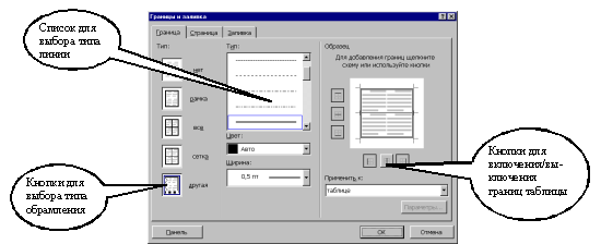 Рис. 1.6. Окно Границы и заливка По умолчанию Word присваивает таблице обрамление типа Сетка (посмотрите в режиме предварительного просмотра, как выглядит таблица c таким обрамлением). Изменим обрамление так, чтобы в таблице не было внутренних вертикальных разделителей, и чтобы внешняя граница таблицы была обведена двойной линией. Поставьте курсор в любую ячейку таблицы (при этом ни одна из ячеек не должна быть выделена). Выберите команду ФорматÞГраницы и заливка. В диалоговом окне (рис. 1.6) выберите тип обрамления Другая. С помощью списка типов линий (чтобы найти двойную линию, придется список прокрутить вниз) и кнопок включения / выключения границ таблицы присвойте одинарную линию внутренним горизонтальных разделителям и двойную линию – внешним границам (см. рис. 1.6). После настройки границ нажмите OK. Проверьте оформление таблицы в режиме предварительного просмотра. Вставка рисункаПоставьте курсор в одну из пустых строк в заголовке приглашения. Выберите команду ВставкаÞРисунокÞИз файла. В разделе Работа 1 (Общие документы) выберите рисунок (winter), и двойным щелчком добавьте его в документ. Если такого рисунка нет, то можете выбрать любой другой рисунок.