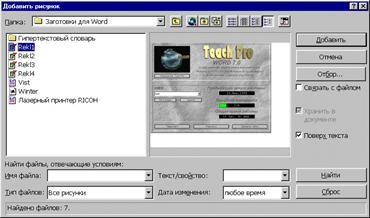 Рис. 1.12. Образец документа "Рекламный лист» Оформление основного текста Основной текст надо разбить на две колонки. Выделите его и выберите команду ФорматÞКолонки. В диалоговом окне выберите вариант «две колонки» и задайте промежуток между колонками 1,0 см. Установите в основном тексте шрифт Times New Roman, размер 8 пт. Выровняйте абзацы основного текста по ширине. Включите в документе перенос слов (команда СервисÞЯзыкÞРасстановка переносов). Для заголовков в основном тексте (например, «Методика обучения» и «Режимы проведения занятий») используйте полужирный курсив, 11 пт. У этих заголовков командой ФорматÞАбзац задайте Интервал перед равным 3 пт. Подзаголовки пунктов (напр., «Непрерывный» и «Пошаговый») оформите шрифтом 10 пт, курсив, подчеркнутый. Если подзаголовок «Контрольный» перешел в первую колонку, то надо специально зафиксировать его как начальную строку второй колонки. Для этого перед абзацем надо вставить разрыв колонки: 1) поставьте курсор перед буквой «К» в подзаголовке «Контрольный»; 2) выберите команду ВставкаÞРазрыв и вариант Начать новую колонку. Контроль текущего состояния документаПросмотрите документ в режиме предварительного просмотра (команда ФайлÞПредварительный просмотр). По высоте в нижней части листа должно оставаться 15–20% пустого пространства, чтобы можно было вставить рисунки и добавить надписи в рамках. 1.4.2. Вставка рисунковТеперь можно добавить в рекламный лист изображения. Выполните следующие действия: 1) Поставьте курсор примерно в то место, где должен быть первый рисунок (в первую или вторую строку левой колонки основного текста). 2) Выберите команду ВставкаÞРисунокÞИз файла. 3) В диалоговом окне вставки рисунка (рис. 1) перейдите в папку Общие документы\Практикум по ИТ\Практические работы по Word\Работа 4 и выберите файл REKL1.GIF. Перед тем, как нажать кнопку Добавить, убедитесь, что в окне включен флажок Поверх текста (рис. 4.1). В режиме «Внутри текста» рисунку нельзя будет назначить обтекание текстом.
