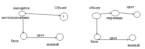 Совместив запрос с сетью получим ответ – пирамида. Классификация сетей. По структуре: Сети простого типа – у которых вершины не имеют собственной внутренней структуры. Однородные сети – при одинаковых отношениях между вершинами. Сети иерархического типа – таким сетям свойственны структуры с вершинами разного ранга, имеющими разный уровень или подчиненность от низших к высшим. По характеру отношений, приписываемых дугам сети: Функциональные сети. Дуги отражают тот факт, что вершина, из которой выходит дуга, играет по отношению к вершине, куда идет дуга, роль аргумента. Описания, соответствующие вершине – функции, задают процедуру нахождения результата. Сценарии – однородные сети, в которых в качестве единственного отношения выступает отношение нестрогого порядка (например, отношение «не раньше, чем»), которое допускает одновременность. Чаще всего эти отношения определяют все возможные последовательности событий. Семантические сети – в отличие от двух первых – неоднородны и иерархичны. Семантические сети делятся на интенсиональные и экстенсиональные. Интенсиональная сеть содержит интенсиональные знания и описывает общую структуру модернизируемой предметной области на основе абстрактных объектов и отношений, т.е. обобщенных представителей некоторых классов объектов и отношений. Например, такие объекты как Производственный участок, груз, деталь могут являться обобщенными понятиями множества значений от которых образуется множество имен конкретных производственных участков (токарный, прессовый и т.п.), множество имен грузов (заготовка, кассета), множество классов деталей (болт, вал, гайка и т.п.). Экстенсиональная семантическая сеть описывает экстенсиональные знания о модернизируемых объектах, являясь как бы «фотографией» его текущего состояния. Интенсиональная сеть предложения «Робот сверлит отверстие в детали сверлом диаметром 10 мм.