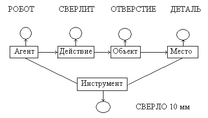 Система, реализующая прямую цепочку рассуждений, на основании имеющихся условий делает возможным логические выводы. Система, реализующая обратную цепочку рассуждений по имеющимся выводам, ищет необходимые для них условия. По такому графу обратный вывод – это поиск пути на графе. Управление последовательностью поиска осуществляется механизмом вывода. Могут быть использованы различные стратегии поиска. Используются также системы с двунаправленными выводами, где сначала оценивается небольшой объем полученных данных и выбирается гипотеза (прямой вывод), а затем запрашиваются данные для принятия решения о пригодности данной гипотезы. Для повышения эффективности функционирования ИС в проблемной области с увеличением числа правил используются методы группирования, упорядочения информации в РП, предварительной компиляции правил в виде графа. Пример работы продукционной системы. Рассматривается роботизированный участок. Правило 1: ЕСЛИ (станок без заготовки) (1) И (заготовка на накопителе) (2) ТО (робот подает заготовку на станок) (3) Правило 2: ЕСЛИ (накопитель подал заготовку в загрузочную позицию) (4) ТО (заготовка в загрузочной позиции) Действия: 1. Допустим, в РП вносятся 1 и 4 образцы и рассматривается возможность применения правил. Сначала МВ сопоставляет образцы из условной части правил с образцами в РП. 2. Если все образцы имеются в РП, то условная часть считается истинной, в противном случае – ложной. Т.к. в условной части (2) отсутствует, то условная часть правила 1 считается ложной. Но правило 2 выполняется, т.к. посылка (4) верна, поэтому МВ выполняет его заключительную часть, и образец (2) заносится в РП. 3. Вторично применяется правило 1, т.к. правило 2 уже было применено и выбыло из числа кандидатов. Т.к. (1) истина и (2) истина, то (3) – вывод. В итоге правил, которые можно было бы применить не остается и система останавливается. 4. Для описания задач часто используют дерево решений. Семантические сети В бытовом понимании семантика означает смысл слова, действия, художественного произведения и т.п. Семантическая сеть – это граф, вершинам которого сопоставляются понятия (объекты, процессы, явления), дуги графа – это отношения между вершинами. Возможные отношения в семантических сетях (не полный список): Агент – это то, что (тот, кто) вызывает действие. Агент часто является подлежащим в предложении. Например, «Иванов ударил мяч». Объект – это то, на что (на кого) направлено действие. В предложении объект часто выполняет роль прямого дополнения. Например, «Робот взял пирамиду». Инструмент – это средство, которое используется агентом для выполнения действия. Например, «Иванов открыл дверь с помощью ключа». Соагент – служит как подчиненный партнер главному агенту. Например, «Иванов сдал экзамен с помощью Петрова». Пункт отправления и пункт назначения – это отправная и конечная позиция при перемещении агента или объекта. Например, «Робот переместился от одного станка к другому». Траектория – это перемещение от пункта отправления к пункту назначения. Например, «Они прошли через дверь по ступенькам на лестницу». Средство доставки – то в чем или на чем происходит перемещение. Например, «Иванов всегда едет домой на машине». Местоположение – то место, где произошло (происходит, будет происходить) действие. Например, «Он работал за столом». Потр
