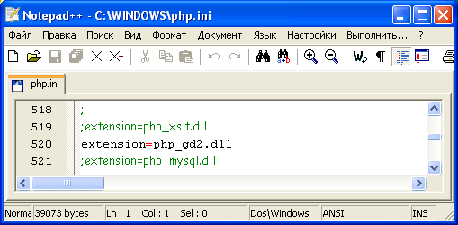 Теперь подключим те расширения, которые понадобятся для работы. Для этого нужно найти место, где впервые упоминается директива extension. Надо добавить (или снять комментарии) непосредственно перед ней следующие команды: extension=php_xsl.dll extension=php_gd2.dll extension=php_mysql.dll Все остальные расширения пока не потребуются. Необходимые библиотеки лучше подключать по мере необходимости (некоторые из них требуют дополнительных настроек).