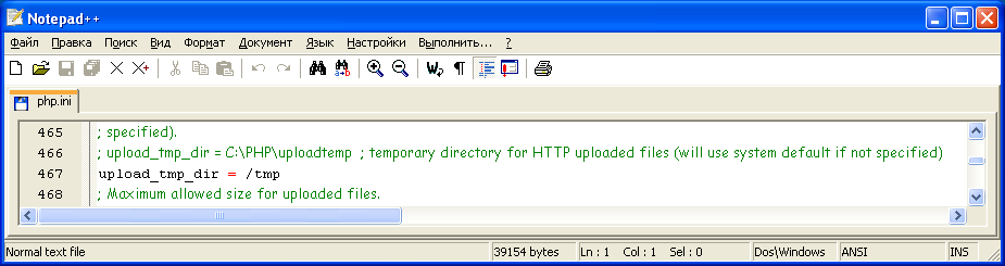 6. Каталог для временных файлов. Найдите директиву: ; upload_tmp_dir = C:\PHP\uploadtemp ; temporary directory for HTTP uploaded files (will use system default if not specified) Отредактируйте ее: upload_tmp_dir = /tmp