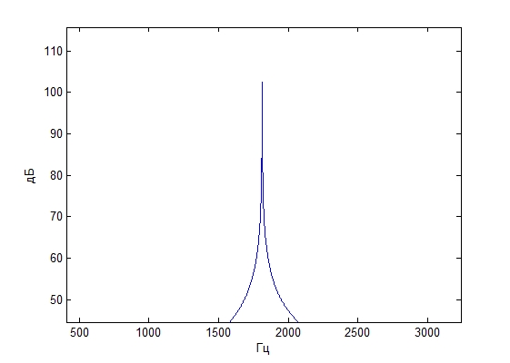 Рис. 14б. Спектр восстановленного сигнала после сдвига его полосы в частотной области на 3Δf. Перекрытие входных выборок 50%