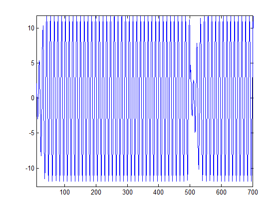 Рис. 8а Стыковка восстановленных во временную области фрагментов сигнала на выходе сформированного канала (без отбрасывания некорректных отсчетов)