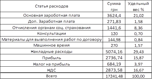 Прибыль Прибыль определяется в процентах от суммы затрат, чаще всего в промежутке (10-35%). Отдельной строкой надо привести налог на прибыль в размере 25% от прибыли (за действующими нормативами на 01.01.2008 г.) (3624,4 + 271,83 +1441,6 +120+144,98 +5074,16 +270)*0,25=2736,74 грн Налог на прибыль 2564,71*0,25=684,19 грн Общие затраты 2736,74 +10946,97 + 684,19 = 14367,9 грн Налог на добавленную стоимость (НДС) НДС исчисляется в размере 20% от общих затрат. Если работа финансируется из государственного бюджета, то НДС не начисляется. 14367,9 * 0,2 = 2873,58 грн Полная стоимость работы, выполненной собственными силами 2873,58 + 14367,9 = 17241,48 грн Таблица 12.2.4 Смета затрат на выполнение научно - исследовательской работы