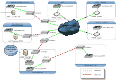 Рис. 1.4. Пример построения смешанной сети IP-телефонии По своему масштабу все сети IP-телефонии можно разделить на международные, региональные и местные. Международная сеть IP-телефонии имеет точки своего присутствия в нескольких странах и обеспечивает терминацию трафика практически в любую точку мира при минимальном использовании телефонной сети общего пользования. Чаще всего, международные сети не работают с конечными пользователями, а предоставляют свою пропускную способность другим сетям. Главной задачей международных сетей является транзит трафика между сетями различного уровня. При построении международной сети в первую очередь строится мощная магистраль, имеющая большую пропускную способность. Международные сети строятся с использованием выделенных каналов и на базе уже существующих сетей Интернет. В отличие от международной сети национальная сеть имеет точки своего присутствия в одной или, в крайнем случае, в нескольких близлежащих странах и обслуживает абонентов и местных операторов только этого региона. С помощью заключения договоренности с международными сетями национальная сеть предоставляет своим абонентам и другим местным сетям возможность терминации вызовов в любую точку мира. Чаще всего, национальные сети строятся национальными телекоммуникационными компаниями с использованием уже существующей инфраструктуры, поэтому большая часть национальных сетей IP-телефонии являются интегрированными сетями Местная сеть IP-телефонии предоставляет возможность абонентам местной телефонной сети и частным компаниям воспользоваться услугами IP-телефонии. В основном, операторы местных сетей являются провайдерами доступа к сети IP-телефонии. Чаще всего, их сети имеют всего один шлюз, подключенный к более крупным сетям через сеть Интернет или по выделенным каналам. Таких операторов часто называют ресселерами, так как они просто перепродают услуги других сетей абонентам местной телефонной сети. В Астраханском государственном университете существует IP сеть (рис. 1.5.). Она построена с использованием маршрутизатора Cisco 3845 Series Integrated Services Routers и коммутаторов Cisco Systems серии Catalyst 2950. Использование этого оборудования дает возможность организовать сеть передачи голоса и факсимильных данных по IP протоколу. Сеть АГУ построена на оборудовании Cisco Systems, для совместимости устройств целесообразно использовать оборудование именно этой фирмы.