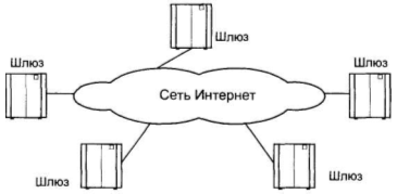 Рис.1.2. Пример построения выделенной сети IP-телефонии В интегрированных сетях IP-телефонии для связи между устройствами используется глобальная сеть Интернет (рис. 1.3.). Это может быть уже существующая собственная сеть или доступ к сети Интернет через провайдеров. Если оператор имеет собственную сеть Интернет, то для предоставления услуг IP-телефонии он лишь устанавливает дополнительное оборудование, которое обеспечивает преобразование речи в данные и наоборот, и модернизирует уже имеющееся оборудование, чтобы обеспечить качество предоставляемых услуг. Если оператор IP-телефонии пользуется услугами провайдеров Интернет, то качество услуг такой сети может быть низким, так как обычные сети Интернет не рассчитаны на передачу информации в реальном масштабе времени.