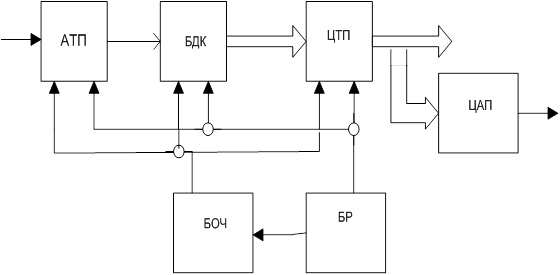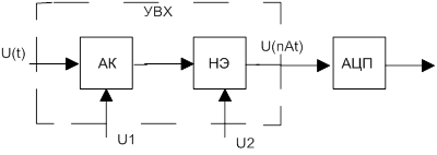 Рис. 2.1 Структурная схема цифрового приемникаАТП – аналоговый тракт приемника БДК – блок дискретизации и квантования ЦТП – цифровой тракт приемника БОЧ - блок опорных частот БР - блок регулировок ЦАП – цифроаналоговый преобразователь Аналоговый тракт приемника выполняет предварительную селекцию и усиление принимаемых сигналов. Его структура и характеристики определяются видом сигнала, уровнем и характеристиками помех, требованиями к качеству приема. Наиболее полно используются преимущества цифровой обработки, если дискретизация и квантование сигнала осуществляются на радиочастоте. В этом случае АТП представляет перестраиваемый преселектор. Но более высокие требования предъявляются при этом к частоте дискретизации и разрядности АЦП, а также к блоку ЦТП. Усиление АТП выбирается таким образом, чтобы собственные шумы приемника на входе БДК превышали шумы квантования. Следует обратить внимание на то, что при достаточно высокой частоте дискретизации уровень сигнала на входе БДК может быть меньше шага квантования. Необходимо лишь, чтобы эффективное значение напряжения смеси сигнала и помех на входе АЦП превышало шаг квантования. Блок дискретизации и квантования представляет собой сложное устройство. Входное аналоговое колебание подвергается в нем двум операциям: дискретизации по времени и квантованию по уровню. Дискретизатор реализуется в виде устройства выборки и хранения (УВХ), состоящего из аналогового ключа (АК) и накопительного элемента (НЭ). Для представления отсчетов сигнала в цифровой форме применяют АЦП. Общий вид БДК представлен на рис.2.2 Рис.2.2 Общая схема БДК Импульсы U1 – стробирующие, U2 – стирающие. Задачей УВХ является определение мгновенного значения напряжения в момент взятия отсчета и его фиксация на время, необходимое для преобразования аналогового значения в цифровую форму. После УВХ сохраняется счетное множество отсчетов колебания. Квантование в АЦП позволяет каждый непрерывный отсчет заменить цифровым значением, представляемым в унитарном или двоичном коде. Цифровой тракт приемника осуществляет основную селекцию сигналов и их демодуляцию. Кроме цифровых фильтров и демодуляторов ЦТП может содержать устройства подавления или компенсации помех, трансмультиплексоры для обработки многоканальных сигналов, цифровые обнаружители и измерители параметров сигналов, цифровые спектроанализаторы и другие устройства выделения информации из принятого сигнала. К ЦТП можно также отнести цифровые системы синхронизации, фазовой и частотной автоподстройки, регулировки усиления, системы обеспечения отказоустойчивости и т.д. Блок опорных частот вырабатывает колебания, необходимые для преобразования частот в приемнике и синхронизации его схем. Блок регулировок БР содержит все необходимые для управления приемником устройсва: блок управления частотой настройки, блок регулировки усиления и чувсвительности, блок управления видами работ ( при смене вида сигнала ) и т.д. Цифровой приемник часто имеет как цифровой выход, так и аналоговый. Для получения аналогового выхода сигнала используется цифроаналоговый преобразователь ЦАП. На рис.2.1 не показаны цепи контроля, индикации и питания приемника.[6] 2.2 Структурная схема цифрового приемника аппаратуры АКА - 16 ПРМ В структурную схему, изображенную на рис.