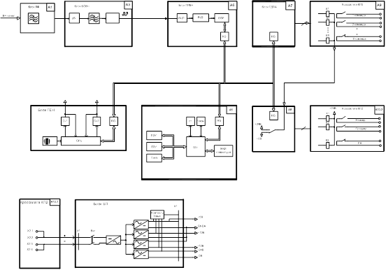 Рис. 2.3 Структурная схема цифрового приемника. 2.3 Линейный тракт приемникаПриемник работает следующим образом. Сигнал, с линейного ВЧ-входа поступает в блок ЛФ, имеющий полосу пропускания 7% от частоты настройки, но не менее 5,5 кГц, где происходит: - подавление зеркального канала до уровня минус 36 дБ; - подавление канала прямого прохождения до уровня минус 35 дБ; - отстройка от параллельно работающего устройства. С выхода блока ЛФ сигнал поступает на блок БОВЧ, где дополнительно фильтруется ФНЧ с частотой среза 1,1 МГц, что позволяет дополнительно снизить уровень частот зеркального канала и канала прямого прохождения на 50 дБ. Ограничение сигнала в БОВЧ происходит на уровне около 7В амплитудного значения, что определяет верхний предел прошедшего без искажений входные цепи сигнала с линии. Для контроля уровня приходящего сигнала служит детектор ВЧ. Для установки необходимого запаса по уровню входного сигнала служит аттенюатор. Аттенюатор имеет 3 ступенчатые регулировки (10, 20 и 30 дБ), и одну плавную (15 дБ). Сигнал проходит через фильтр с полосой пропускания 3,2 кГц. Затухание фильтра при расстройке от края полосы на 6 кГц составляет 85 дБ. Далее сигнал усиливается и ограничивается по амплитуде двухкаскадным усилителем. С первого каскада усилителя сигнал, кроме того, подается на детектор, формирующий сигнал для контроля уровня НЧ-сигнала. 2.4 Функциональная схема аппаратуры каналов автоматики АКА-16 ПРМ Функциональная схема АКА-16 ПРМ приведена в Приложении 2.[4] Функционально и конструктивно АКА-16 ПРМ состоит из следующих основных блоков: А1 - блок входного фильтра (ЛФ); А2 - блок питания (БП); А3 - блок обработки высокочастотный (БОВЧ); А4 - блок синтезаторов частот (ГЕН); А5 - блок центрального процессора (ПРЦ); А6 - блок приемника высокочастотный (ПРВЧ); А7 - блок управления выходными реле (ПДПА); А8 - блок вспомогательных устройств (БВ1); А9 - кроссплата КП5; А10 - кроссплата КП2. Схема индикации предназначена для отображения информации о состоянии АКА-16 ПРМ: прием КЧ; предупреждение; неисправность. Блок ПРВЧ предназначен для выделения сигнала передатчика из спектра сигналов и помех, принимаемых по проводам воздушных линий электропередачи и преобразования его в частоты команд противоаварийной автоматики, а также для формирования контрольных уровней принимаемых сигналов. Блок ГЕН предназначен для программно-аппаратной реализации генераторов частот, необходимых для работы блока ПРВЧ. Блок ГЕН состоит из следующих основных функциональных узлов: устройство управления и контроля синтезаторов частот; блок синтезаторов частот; формирователь несущей частоты; формирователь системной шины. В состав устройства управления и контроля синтезаторов частот входят: управляющий контроллер, построенный на микросхеме AT90S4433, с задающим кварцевым резонатором 8 МГц и цепью сброса ; генератор стабильной частоты 32768 Гц со стабильностью ±2*10-6 в диапазоне температур от минус 40°С до +70°С; триггер Шмидта ; мультиплексор контроля каналов ; развязывающие резисторы . Блок ПРЦ предназначен для реализации алгоритма работы АКА-16 ПРМ. В состав блока ПРЦ входят плата ПРЦ и Панель индикации. Плата ПРЦ состоит из следующих основных функциональных узлов: центральный процессор ; формирователь системной шины ; постоянное запоминающее устройство ; flash – память ; устройство перезапуска ; Цен