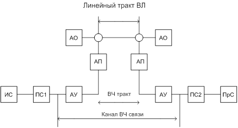 Рис. 1.3 Структурная схема организации канала связи. 1.3 Особенности ВЧ связи по ВЛНадежность линии электропередачи значительно выше надежности воздушных и кабельных линий связи благодаря высокой прочности линейных проводов и поддерживающих конструкций (опор). Линии электропередачи повреждаются только при мощных природных воздействиях, таких как ураган, гроза или очень сильный гололёд, в то время как воздушные линии связи повреждаются при сильном ветре, сравнительно небольших гололёдных образованиях, а кабели повреждаются землеройными механизмами, при оползнях, половодьях, вибрациях почвы от автотранспорта и других причинах. Во многих случаях линия электропередачи (ЛЭП) является кратчайшим путем, связывающим энергетические предприятия (например, подстанции), между которыми нужны каналы связи. При этом отпадает необходимость в строительстве линии проводной связи, а также, и это очень важно, в организации их эксплуатации. Эксплуатация ВЛ, требующая специальной линейной службы с большим количеством персонала, ведется независимо от организации по ней каналов связи. По этим причинам затраты на сооружение и эксплуатацию каналов связи по проводам ВЛ значительно меньше аналогичных затрат на каналы по специальным воздушным, кабельным или радиорелейным линиям связи. В то же время использование для связи проводов ВЛ сопряжено с рядом трудностей, которые приходится учитывать при конструировании аппаратуры и проектировании каналов связи. Повода ВЛ нормально находятся под высоким напряжением промышленной частоты. Вследствие этого по ВЛ возможна только ВЧ связь с использованием таких частот, которые сравнительно простыми средствами могут быть отделены от промышленной частоты. Для подключения передатчика и приемника аппаратуры уплотнения к проводам ВЛ необходима специальная аппаратура присоединения, не применяемая ни в каких других областях техники связи.[1] На станциях и подстанциях фазные провода ВЛ подключаются к специальным шинам. К ним также подключено оборудование высокого напряжения (выключатели, трансформаторы, разъединители), которое может иметь низкое сопротивление для токов рабочей частоты каналов связи. В этом сопротивлении поглощается часть энергии сигналов высокой частоты. Кроме того, бывают случаи отключения ВЛ с обеих сторон от шин подстанции и заземления на подстанции её проводов. Работа каналов ВЧ связи в этих случаях также не должна нарушаться. По этим причинам в провода ВЛ у подходов к шинам включается последовательно аппаратура обработки (высокочастотные заградители), имеющая низкое сопротивление для токов промышленной частоты и высокое сопротивление для токов высокой частоты. Конфигурация сети высокого напряжения не остаётся неизменной. С появлением новых потребителей энергии в линии врезаются новые подстанции, что часто приводит к необходимости реконструировать каналы связи, идущие по этим линиям. Эта реконструкция бывает связана со сложной перестройкой или даже заменой аппаратуры связи, установкой дополнительных устройств обработки и присоединения. Некоторые трудности в создании и проектировании каналов ВЧ связи по ВЛ обусловлены конструктивными особенностями ВЛ. Линии электропередачи являются многопроводными системами с числом проводов от трех до нескольких десятков (двухце