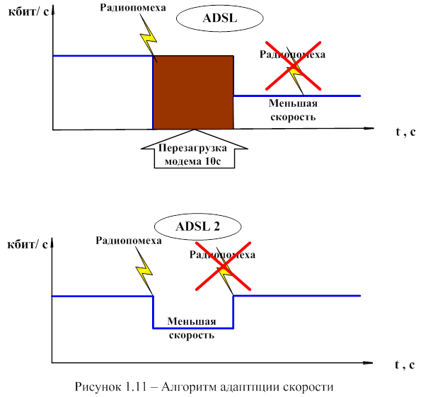 Рисунок 1.10 – Алгоритм объединения данных Еще одним дополнительным адаптивным алгоритмом, реализованным в технологии ADSL2, является алгоритм адаптации скорости (Seamless Rate Adaptation, SRA). Рассмотрим случай, когда на канал передачи воздействует нерегулярная помеха (рис.1.11), например радипомеха от внешнего источника. Эта помеха присутствует только в течение ограниченного времени. В традиционной технологии ADSL реакция в системе доступа будет следующей. Радиопомеха вызывает повышение уровня шумов во всем диапазоне или в его части. Как следствие, с существующими параметрами настройки передать информацию оказывается невозможным. Модем начинает перезагрузку и повторную инициацию. Инициация занимает в среднем 10 с. В процессе инициации пара модем-DSLAM устанавливает новые параметры обмена и новую совокупную скорость передачи в канале. Даже если после этого радиопомеха исчезнет, скорость обмена останется меньше той, которая была установлена изначально. Алгоритм SRA (см. рис.1.11) выполняет подстройку скорости в режиме реального времени без необходимости перезагрузки модема. Для этого устанавливается режим изменения схемы модуляции без влияния на параметры циклового синхронизма, что в традиционной технологии ADSL не предполагалось. В результате применения алгоритма SRA при появлении радиопомехи скорость обмена данными уменьшается, но как только помеха устраняется, скорость принимает начальное значение.