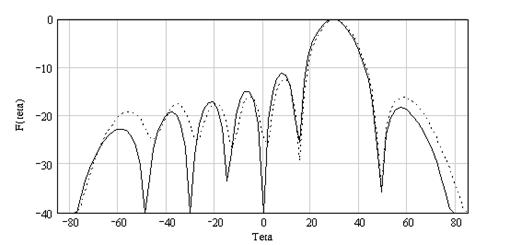 Рис. 4.4 ДН ФАР, 2х2 (открытая структура) Для наглядности анализа ДН ФАР с учетом и без учета взаимной связи строились на одном графике. На всех нижеприведенных рисунках сплошная линия обозначает ДН без учета взаимной связи, штриховая линия – ДН с учетом взаимной связи.