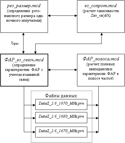 амплитудное распределение, линейные размеры антенной решетки, то определив 3. Программы для расчета характеристик ФАР 3.1 Общие сведенияВ результате дипломной работы был создан пакет программ, предназначенный для расчета полевых и импедансных характеристик плоской ФАР, излучатели в составе которой представляют собой полосковые вибраторы или резонаторные излучатели, выполненные на многослойном диэлектрике (см. рис.2.1 и рис.2.2). Для каждого типа диэлектрика разработан собственный пакет. Эти пакеты идентичны, имеют одинаковые алгоритмы расчета и интерфейс, поэтому в дальнейшем будем рассматривать только один из пакетов. Программный пакет выполнен в рамках математического пакета для инженерных расчетов Mathcad 2001, который благодаря наглядной форме отображения расчетных соотношений и результатов доступен для понимания пользователями. Кроме того, формулы, выходные данные, графики, построенные в данном пакете, могут быть легко импортированы в современные текстовые редакторы, такие как Word, что удобно при создании научных статей, отчетов и других работ. Пакет, структурная схема пакета приведена на рис. 3.1, включает четыре программы, каждая из которых выполняет определенные функции: · ФАР_вз_связь.mcd – центральная программа пакета и выполняет расчет определение полевых и импедансных характеристик ФАР с учетом и без учета взаимной связи между излучателями; · вз_сопрот.mcd – вспомогательная программа пакета и предназначена для исследования зависимости взаимного сопротивления излучателей от расстояния между ними; · рез_размер.mcd – программа, вычисляющая входное сопротивление излучателя при различной его длине и ширине. Эта программа может быть полезна при определении резонансного размера излучателя bрез; · ФАР_полоса.mcd – программа выполняющая расчет полевых и импедансных характерисик ФАР в полосе частот по результатам, полученным в программе ФАР_вз_связь.mcd. Эти результаты записаны в файлах данных.