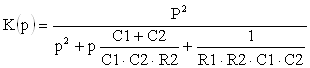 Дана схема виконує обернену функцію ніж схема, описана в розділі 2.2. Тому розрахунок схеми є аналогічним, але із врахуванням окремих моментів. Коефіціент передачі фільтра, зображеного на рис. 2.3.1, виражається через формулу Скориставшись фільтром прототипом [1] передавальну функцію запишемо так S – оператор Лапласа по частоті зрізу ωзр для ВЧ-фільтра запишеться так: S = ωзр/р. (2.3.3) Підставивши вираз (2.3.3) у формулу (2.3.2) отримаємо: Прирівнявши вирази К(р) і Н(р) отримаємо наступні рівняння: Приймемо рівними R1=R2=R=10 кОм. Тоді із рівняння (1.3.5) випливає: С1=С2=С= де Розрахуємо Ємність С приймаємо стандартний номінал 15 нФ. Для мінімізації по постійному струму опір зворотнього зв’язку приймемо в двічі більшим R: R3 = 2R = 20 кОм. Приведемо результати аналізу розрахованої схеми