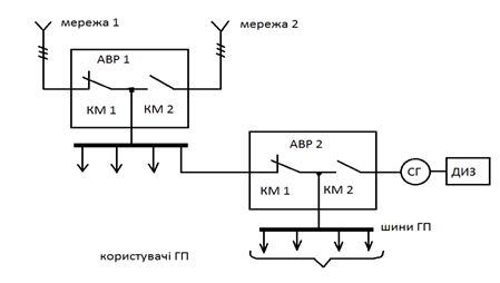 Під безперебійним живленням (БЖ) варто розуміти забезпечення засобів зв'язку й автоматизації електроенергією в будь-яких режимах роботи СЕЖ, за винятком аварій агрегатів безперебійного живлення й струморозподільної мережі. Обчислювальні пристрої, об'єднані в мережі, більше піддані помилкам через проблеми з електроживленням. Це відбувається через те, що, наприклад, з різних причин обладнання мережних вузлів зберігає дані різного роду в оперативній пам'яті, і ймовірність втрати або спотворення цих даних, а також імовірність збою в роботі обладнання істотно зростає при зниженні якості електроживлення. Фінансові втрати від таких збоїв тим більше, чим більш відповідальну функцію виконує мережний вузол. У таблиці представлені основні види неполадок у мережах електроживлення і їх наслідки. Для забезпечення споживачів гарантованим живленням використовуються резервні джерела живлення (резервна мережа або резервна електростанція). Запровадження в дію резервних джерел відбувається автоматично. Пристрою, що забезпечують автоматичне включення резервного джерела, одержали назву пристроїв автоматичного включення резерву. Принцип побудови системи гарантованого живлення за допомогою пристроїв АВР показаний на Рис.1.1 Пристрої АВР складаються із двох контакторів - КМ1 (нормальної роботи), КМ2 (аварійні роботи) і ланцюгів керування цими контакторами, які забезпечують контроль напругі джерел живлення, їхнє перемикання й блокування.