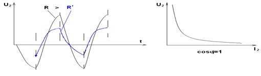 Рис.2.4.3 Графік перетворювачів на тиристорах Недоліком такого інвертора є сильна залежність вихідної напруги від струму навантаження. Для зменшення впливу характеру і величини навантаження на форму і величину вихідної напруги застосовують схеми із зворотними діодами, які у свою чергу необхідні для повернення реактивної енергії, накопиченої в індуктивному навантаженні і реактивних комутуючих елементах в джерелі живлення перетворювача. 3. Синтез структурної схеми Відповідно до технічного завдання необхідний пристрій, в якого на виході буде напруга та струм. У зв'язку з цим пристрій повинен живитися від акумулятора із постійною напругою 9…14В. Для виконання покладених на пристрій завдань він повинен містити вихідний підвищувальний трансформатор, який перетворюватиме постійну напругу 12Вв змінну 220В. Для забезпечення захисту пристрою від неправильно увімкненої напруги живлення, момент включення пристрою, необхідний пристрій захисту, який забезпечить захист пристрою. Щоб перетворювати постійну напругу в змінну необхідний пристрій перетворення постійної напруги в змінну, а також пристрій управління цим перетворювачем. Для здобуття необхідної нам постійної напруги на виході нам необхідний вихідний підвищувальний трансформатор. Для управління всіма пристроями необхідний пристрій управління, який включає в себе (мультивібратор, та змінні резистори). Для контролю вихідної напруги і струму необхідний пристрій індикації. Щоб захистити всі системи пристрою від перевищення напруги та перенавантаження, від обриву фази необхідні схеми захисту від цих чинників. Для здобуття напруги живлення низьковольтних пристроїв необхідне вторинне джерело живлення, яке вироблятиме необхідні напруги. 3.1 Опис структурної схеми інвертораСтруктурна схема джерела інвертора представлена Рис.3.1.1. Побудова систем інвертного живлення залежить від вирішуваними ними задач. В деяких випадках необхідно якнайменший час переключення навантаження на живлення від АБ чи навпаки. В інших потрібно забезпечити довготривалу роботу від АБ, при цьому час переключення не являється критичною величиною. Тобто, можна сказати, що для кожного конкретного випадку потрібно вирішувати іншу технічну задачу. Розроблюваний блок для забезпечення безперервного живлення різноманітних пристроїв (серверів, персональних комп’ютерів, модемів та ін.) напругою 220В, 50Гц. Система призначена для живлення пристроїв, що мають джерела живлення т 220В 50Гц. Це дозволяє зменшити вимоги щодо розробки нашого приладу, так як імпульсні джерела живлення здатні працювати з мережею ± 20% від нормального значення. Ще однією перевагою є здатність їх працювати, що мають не синусоїдальну характеристику напруги (апроксимована синусоїда, квазі синусоїда). Розглянемо основні блоки, що входять до складу пристрою: 1. Пристрій формування імпульсів. 2. Акумуляторна батарея. 3. Пристрої захисту. 4. Пристрій комутації. 5. Трансформатор вихідний. Для забезпечення роботи та функціонування всіх частин ДБЖ, необхідна ланка, котра здійснювала б зв’язок між всіма цими частинами. Можна розглянути декілька видів таких схем: 1. Аналогові системи, операції регулювання в яких здійснюються шляхом порівняння, підсилення, перетворення аналогових сигналів. Похибка установки параметрів в такій системі сильно залеж