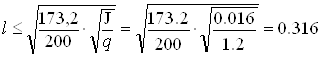 де l – довжина прогону між ізоляторами, м; J – момент інерції поперечного перерізу шини відносно осі, перпендикулярної до напрямку згинаючої сили, см4; q – поперечний переріз шини, см2. З цієї формули визначаємо довжину прогону l за умови, що частота власних коливань буде більша 200 Гц. Для цього знайдемо найбільше значення, яке задовольняє нерівність:
