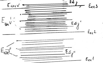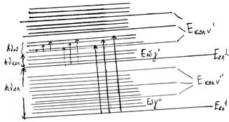 Еел 1, Еел 2, Еел 3 – три різні електронні стани молекули. Кожному електронному стану відповідає своя система коливних рівнів. Екол v¢¢, Екол v¢, Екол v, а кожному коливному рівню – своя система обертових підрівнів Еоб j¢¢, Еоб j¢, Еоб j. Розглянемо квантові переходи в системі рівнів (мал.), обмежившись для простоти тільки основним і першим збудженим електронними станами. Тоді n = Е2 – Е1 = (Еел 2 – Еел 1) + (Екол v¢ – Екол v¢¢) + (Еоб j¢ – Еоб j¢¢) = = DЕел + DЕкол + DЕоб = hnел + hnкол + hnоб. 1) Якщо Еел = Екол = 0, то відбуватимуться тільки переходи між обертовими рівнями якого-небудь електронно-коливного стану. 2) Якщо Еел = 0, а Екол ¹ 0 і Еоб ¹ 0. В цьому випадку виникають складніші обертово-коливні переходи, оскільки він проходить між обертовими підрівнями різних коливних станів (але одного електронного стану). 3) Якщо Еел ¹ 0; Екол ¹ 0 і Еоб ¹ 0, то відбудеться електронно-коливно-обертовий перехід.