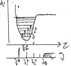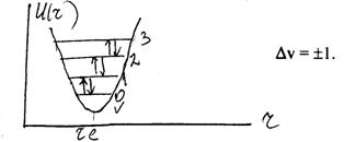 представити у вигляді U (r – rе) = Ug = k З розв’язку рівняння Шредінгера енергія гармонічного осцилятора квантується і визначається слідуючою формулою Екол.v = v – коливне квантове число, яке набуває значення 0, 1, 2, 3…. Даному виразу енергії відповідає система рівновіддалених рівнів енергії, віддаль між якими складає hn0.