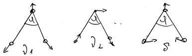 Мал. Схематичне зображення обертово-коливних переходів двохатомних молекул. В даній системі рівнів можливі дві групи переходів, що супроводжуються збільшенням Δj = ±1, або зменшенням Δj = –1 обертового квантового числа. Переходи, для яких Δj = ±1 утворюють так звану R-гілку обертово-коливного спектру, а переходи, для яких Δj = –1 утворюють Р-гілку цього спектру. Чисто коливний перехід (Δj = 0) є забороненим (пунктирна лінія). Слід відмітити, що характерні обертово-коливні спектри виникають тільки у випадку дослідження розрідження газів. Коливання багатоатомних молекул. Коливання двохатомної молекули можна розглядати як коливання одиничного гармонічного або ангармонічного осцилятора з приведеного масою М і квазіпружного постійного k. На відміну від цього уже трьохатомна молекула володіє не одною, а кількома коливними степенями волі. У зв’язку з цим коливний спектр багатоатомної молекули містить цілий набір ліній і полос, частоти і інтенсивності яких відображають всі особливості її складного обертово-коливного руху. Як було показано раніше, чисдл коливних ступенів волі для лінійної молекули рівне 3N – 5, а для молекули будь-якої геометричної конфігурації 3N – 6, де N – число атомів у молекулі (кожна молекула характеризується трьома поступальними і трьома обертовими степенями волі. Задача про коливний рух багатоатомної молекули – це задача про відносний рух її атомів, який не супроводжується переміщенням молекули в просторі і обертанням як цілої частини. Оскільки коливання окремих атомів в молекулі зв’язані один з одним, то таку задачу можна розглядати як складний коливний рух у вигляді суперпозиційних коливань цілого набору зв’язаних осциляторів. Розв’язання цього питання починається з вибору вихідної системи координат, в якій розглядається взаємне переміщення часток, що утворюють молекулу. Найбільш зручною координатною системою є система координат, яка задається розміщенням атомів у молекулі і характеризується значеннями довжин зв’язків і кутів між зв’язками. У зв’язку з цим природними коливними координатами називають зміну довжини зв’язків і валентних кутів при відповідних коливаннях. Так, наприклад, природними координатами молекули Н2О є довжини зв’язків О–Н (r1 і r2) і величина кута між цими зв’язками j. При цьому коливними координатами служать q1, q2 і q3, що характеризують зміну вказаних природних координат: q1 = r1 – r1e; q2 = r2 – r2e; q1 = j – je, де r1e, r2e і je – рівноважні значення природних координат. Загальне число коливних координат (q) рівне числу коливних ступенів волі ρ = 3N – 6 (або 3N – 5) для лінійних молекул. Основна задача, яка стоїть при розгляді коливного руху багатоатомної молекули полягає в тому, щоб виразити повну енергію Екол коливного руху, яка є сумою кінетичної Екін і потенціальної енергії Еп енергій через природні коливні координати, маси часток і квазіпружні постійні. Енергія збудження, що попадає на один із осциляторів, на окремий хімічний зв’язок в молекулі перерозприділяється через деякий час на інші зв’язки, тобто всі атоми і хімічні зв’язки починають коливатися. Моделью таких коливань є коливання двох зв’язаних маятників. Такі маятники мають одинакову частоту коливання, причому прийнято вважати, що кожен з маятників ізольовано коливається як гармонічний осцилятор. Якщо такі маятники з’єднати пружно