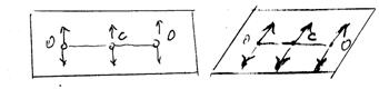 Мал. Коливання молекули СО2. Як бачимо, коливання у молекулах бувають вироджені і невироджені. Виродженими називають нормальні коливання різної форми, що відбуваються з одинаковою частотою, тобто енергія коливання у них одинакова. Для молекул, симетрія яких описується групами нижчої симетрії, тобто це групи симетрії, що не мають осей вищого порядку, можливі тільки невироджені коливання – кожному коливанню відповідає своя частота. Число різних частот нормальних коливань рівне числу коливних ступенів волі. Для молекул, рівноважна конфігурація яких описується групами симетрії середньої категорії (присутня одна вісь вищого порядку, поряд з невиродженими коливаннями є два рази вироджені коливання), тобто пара коливання різної форми, що здійснюються з одинаковою частотою. В цьому випадку число різних частот нормальних коливань буде менше числа коливних ступенів волі. Для молекул, рівноважна конфігурація яких відноситься до груп симетрії вищої категорії, які мають по декілька осей вищого порядку. Такі молекули мають поряд з невиродженими і двовиродженими містять і триразвироджені коливання, тобто три коливання різної форми, але з одинаковою частотою: СН4 – 35 – 6 = 9 колив. (прояв. 4). Число коливань з різною частотою можливих коливних координат; в цьому випадку буде набагато менше число ступенів волі. Для характеристики властивостей симетрії коливань використовують спеціальні позначення у вигляді символів з різними індексами. Невироджені коливання симетричні або антисиметричні відносно осі симетрії Cn, позначають буквами А або В: А – невироджені відносно осі Cn; В – антисиметричні невироджені відносно осі Cn. Індекси gi при А і В позначають відповідно симетричне або антисиметричне коливання по відношенню до i (центра симетрії). Підстрочні індекси 1 і 2 позначають симетричні і антисиметричні коливання по відношенню до операції відбиття у вертиальній площині симетрії σv, в якій лежить вісь. Надстрочні індекси штрих (¢) або два штрихи (²) при прописних буквах позначають симетричні і антисиметричні коливання відносно відбиття в горизонтальній площині симетрії σn. І, накінець, індексами q або u, розміщеними як і цифри 1 і 2 справа внизу біля символа, позначають коливання симетричні або антисиметричні відносно центра симетрії. Для 2-х