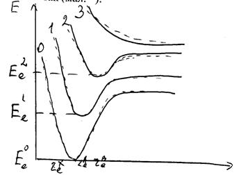 Мал. Потенціальні криві для електронних станів двохатомної молекули: 0 – для основного стану re; 1, 2 – для стійких збуджених станів; 3 – крива відштовхування. Для кожного електронного стану характерний свій набір коливних рівнів енергії, а кожен коливний набір – обертових рівнів. Хвильова функція yе, що являє собою розв’язок електронного рівняння Шредінгера, описує електронний стан молекул, тобто розподіл електронної густини. Електронні стани можуть бути невиродженими і виродженими, якщо одному значенню енергії відповідає одне або декілька хвильових функцій, а степінь виродження стану рівна числу таких функцій. Вироджені стани зустрічаються в молекулах середньої і власної симетрії. На