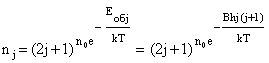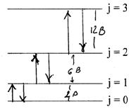 Мал. Енергетичні рівні жорсткого ротатора і переходи між ними (Δj = ±1). Обертовий рух лінійної молекули (два ступені волі) повністю визначаються квантовим числом j та його проекцією nj на вісь молекули. Степінь виродження обертових енергетичних рівнів лінійної молекули: qj = 2j + 1, j = 0, 1, 2 …. У стані рівноваги заселеність енергетичних рівнів: