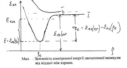 Мал. Схема переходів між електронними, коливними та обертовими рівнями в молекулі. На схемі (мал.) показано тільки декілька переходів, кінцевими для яких є одні і ті ж обертові підрівні. В дійсності, число різних обертових переходів, що відповідають даному коливному рівню, може бути значно більше, число обертово коливних переходів ще більшим. Залежність електронної енергії молекули від віддалі між ядрами. Важливим наслідком того, що маси електронів надзвичайно малі порівняно з масою ядер, є те, що електрони рухаються в молекулі значно швидше, ніж ядра. Саме цим визначається те, що енергії коливання і обертання значно менші, ніж електронна енергія. Внаслідок цього фізично обгрунтованим є розгляд руху електронів у молекулі при заданому положенні ядер, вважаючи їх нерухомими. Відповідно розглядається енергія молекули в кожний даний момент при певному положенні ядер, тобто електронна енергія для миттєвої конфігурації ядер, а також зміна електронної енергії із зміною віддалі між ядрами. При розгляді характеристики електронної енергії молекули як функції відносних координат ядер в електронну енергію молекули включається: 1) кінетична енергія електронів, 2) енергія взаємодії електронів з нерухомими ядрами і між собою, 3) а також енергія взаємодії ядер між собою. В електронну енергію молекули не входить кінетична енергія ядер. Назва «електронна енергія» вказує на те, що враховується тільки рух електронів, але не рух ядер. Електронна енергія молекули як функція координат ядер ρ1, ρ2, …, ρk (дк k – число незалежних координат) запишеться: eел = eел(ρ1, ρ2, …, ρk). Вияснимо загальний характер залежності електронної енергії від координат ядер. Перш за все, електронна енергія при нерухомих ядрах не залежить від положення в просторі заданої конфігурації ядер як цілого, електронна енергія є функцією тільки відносних координат ядер. Тому під ρ слід розуміти незалежні відносні координати ядер. Для простого випадку двохатомної молекули є лише одна така координата – віддаль ρ між двома ядрами eел = eел(ρ). Розглянемо