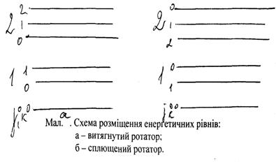 Для обертових постійних симетричного ротатора: витягнутого – А > B = С, сплюснутого – А = В > С. Обертова енергія симетричного ротатора задається двома квантовими числами j і k. k – проекція повного обертового моменту кількості руху молекули на рухому вісь і набуває значення від – j до +j (2j + 1). Тоді: j = 0, 1, 2, 3…; k = 0, ±1, ±2…. Степінь виродження енергетичних рівнів симетричного ротатора qj, k = 2 (2j + 1), тоді заселеність енергетичних рівнів:
