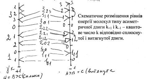 Правила відбору (дозволені переходи між комбінуючими енергетичними рівнями) Δj = ±1; Δk = 0. Система енергетичних рівнів симетричного ротатора визначається двома квантовими числами. Схема розміщення цих рівнів для витягнутого і сплющеного ротатора приведена на мал. Якщо врахувати центробіжні сили між ядрами, то для Еjk = 2Bj (j + 1) – 4Dj (j +1)3 – 2Djk(j + 1) k2. Спектри обертання молекул типу асиметричного ротатораДля