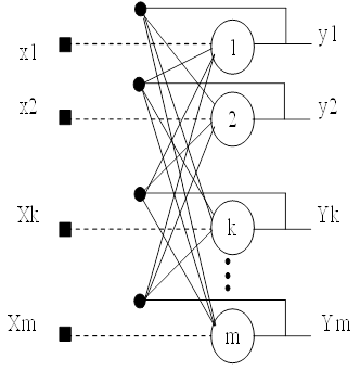 Рисунок 6 - Структурная схема сети Хопфилда Если, например, сигналы представляют собой некие изображения, то, отобразив в графическом виде данные с выхода сети, можно будет увидеть картинку, полностью совпадающую с одной из образцовых (в случае успеха) или же "вольную импровизацию" сети (в случае неудачи). На стадии инициализации сети весовые коэффициенты синапсов устанавливаются следующим образом: