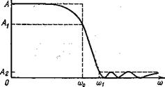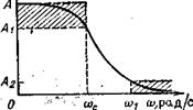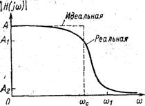 Рис. 1.2. Идеальная и реальная амплитудно-частотные характеристики фильтра нижних частот В качестве полосы пропускания выбирается диапазон частот, где значение амплитудно-частотной характеристики превышает некоторое заранее выбранное число, обозначенное А1 на рис. 1.2, а полосу задерживания образует диапазон частот, в котором амплитудно-частотная характеристика меньше определенного значения, например, А2. Интервал частот, в котором характеристика постоянно спадает, переходя от полосы пропускания к полосе задержания, называется переходной областью ωс < ω < ω1. Значение амплитудно-частотной характеристики можно также выразить в децибелах (дБ) следующим образом: