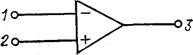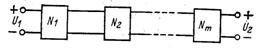 Рис. 1.3. Операционный усилитель Одним из наиболее часто применяемых активных приборов, который в основном и будет использоваться, является интегральная схема (ИС) операционного усилителя или ОУ, условное изображение которого приведено на рис. 1.3. Операционный усилитель представляет собой многовходовый прибор, но для простоты показаны только три его вывода: инвертирующий входной (1), неинвертирующий входной (2) и выходной (3). В идеальном случае ОУ обладает бесконечным входным и нулевым выходным сопротивлениями и бесконечным коэффициентом усиления. Практические ОУ по своим характеристикам приближаются к идеальным наиболее близко только для ограниченного диапазона частот, который зависит от типа ОУ. В некритических конструкциях фильтров наиболее часто используются дешевые угольные композиционные резисторы. Для фильтров четвертого и более низкого порядка достаточно применять угольные композиционные резисторы с 5%-ными допусками, в частности если предполагается использовать фильтр при комнатной температуре. Для фильтров с высокими рабочими характеристиками необходимо применять высококачественные типы резисторов, например металлопленочного и проволочного типов. Чем выше порядок, тем меньше должны быть допуски. Фильтры с порядком выше четвертого необходимо реализовывать на резисторах с 2-%-ным или меньшими допусками. Что касается конденсаторов, то наиболее подходящим типом является майларовый конденсатор, который можно успешно применять в большинстве конструкций фильтров. Конденсаторы на основе полистирола и тефлона лучше, однако применяются в высококачественных фильтрах. Обычные экономичные дисковые керамические конденсаторы должны использоваться исключительно в наименее критических условиях. 1.4 Построение фильтров Существует много способов построения фильтра с заданной передаточной функцией n-го порядка. Один популярный способ заключается в том, чтобы представить передаточную функцию в виде произведения сомножителей H1, H2,…, Нт и создать схемы или звенья, или каскады N1, N2,…, Nm, соответствующие каждому сомножителю. Наконец, эти звенья соединяются между собой каскадно (выход первого является входом второго и т.д.), как изображено на рис. 1.4. Если эти звенья не влияют друг на друга и не изменяют собственные передаточные функции, то общая схема обладает требуемой передаточной функцией n-го порядка. Ранее было установлено, что ОУ обладает бесконечным входным и нулевым выходным сопротивлениями. Таким образом, его можно использовать для реализации невзаимодействующих звеньев.