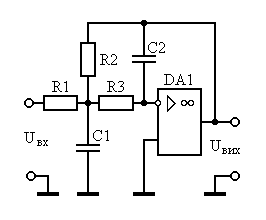 где A и B – числовые значения перед wп2 и рwп в знаменателе W1(р). Находим ёмкость C2 из соотношения С1>[4(çКç+1)QF2]C2. Определяем два значения R2 (для разных знаков перед корнем):