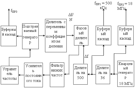 Рисунок 2. Формирование сигнала с ОБП. В качестве балансных модуляторов БМ1, БМ2, БМ3 представляется разумным применение аналоговых перемножителей в микросхемном исполнении. Например, балансный модулятор К174ПС1 имеет малый коэффициент нелинейных искажений, может работать в полосе частот до 200 МГц. Также несомненным достоинством таких БМ является обладание определённым коэффициентом усиления. Это позволяет сохранять постоянный необходимый для работы БМ уровень сигнала при подавлении его фильтром. Следует отметить и то, что в таком БМ напряжение с частотой fПР значительно подавляется. Далее сформированный сигнал с ОБП усиливается с помощью предварительного (ПУ) и оконечного (ОК) усилителей. Важной их особенностью является способность усиливать сигнал с минимальными искажениями. В качестве предварительного усилителя возможно применение каскада с общим коллектором, обладающего коэффициентом усиления по мощности » 100. Коэффициент усиления по мощности оконечного каскада, согласно проведенным расчетам составляет » 27,5. При этом схема формирования сигнала с ОБП будет работать при малом уровне мощности (» 10-3 Вт), что является необходимым для ее корректного функционирования. При помощи согласующей цепи (СЦ) осуществляется согласование низкого выходного сопротивления транзистора ОК с нагрузкой (фидером). Так как данный передатчик должен обеспечивать перестройку рабочей частоты в довольно широком диапазоне, СЦ также должна быть широкополосной. Для этого здесь применим трансформатор на длинных линиях. К данному передатчику предъявляются довольно жесткие требования по величине внеполосных излучений. Для выполнения этих требований на выходе передатчика включается фильтрующая цепь (ФЦ). Для передатчиков с ОБП предъявляются жесткие требования к стабильности выходной частоты. Для реализации этого требования, а также для предотвращения возникновения частотных искажений при формировании сигнала с ОБП, частоты fПР1, fПР2, fПР3 должны иметь малую относительную нестабильность DfПР/fПР » 10-6, то есть стабилизироваться кварцем. Кроме того, частота fПР3 должна перестраиваться в диапазоне ( 24,5 ¸ 29,5 ) МГц с шагом 1 кГц. Таким образом, для реализации приведенных выше требований здесь удобно применить синтезатор сетки частот, причем для миниатюризации передатчика воспользуемся косвенным методом синтеза. Структурная схема такого синтезатора представлена на рис.3.