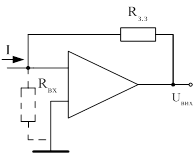 Вихідна напруга перетворювача струм-напруга пропорційна вхідному струму І (струм джерела), помноженого на опір резистора зворотнього зв’язку Rз.з.: Uвих = ІRз.з. (7) Для підвищення роздільної здатності перетворювача струм-напруга необхідно, щоб сигнальний струм перевищував значення вхідного струму операційного підсилювача. Тому при вимірюванні малих струмів варто використовувати операційні підсилювачі з найменшими вхідними струмами, підсилювачі з польовими транзисторами на вході (рисунок 2). Ця схема також доцільна у використанні якщо немає операційного підсилювача з малими вхідними струмами. Резистор R2 потрібен для балансування вихідної напруги. Конденсатор С3 призначений для зменшення вихідної шумової напруги. Для сучасних операційних підсилювачів, що мають коефіцієнт підсилення А порядку декількох десятків тисяч вхідний опір перетворювача струм-напруга складає лише декілька Ом.